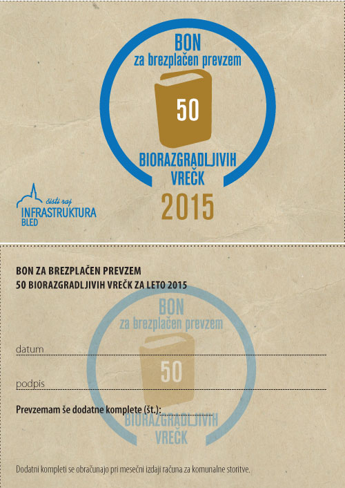 Infrastruktura Bled d.o.o. will supply, free of charge, every single household that doesn’t compost its biodegradable kitchen waste, on the basis of a coupon, a brown container for collecting biodegradable waste (10 l) and 50 biodegradable bags. The household will collect its biodegradable waste separately, and then dispose of it into the brown containers with the appropriate label, which will be located: